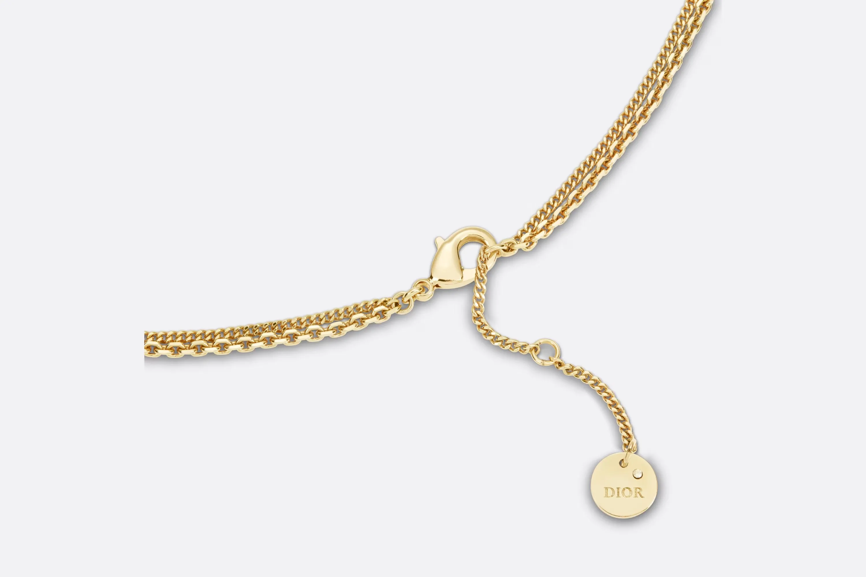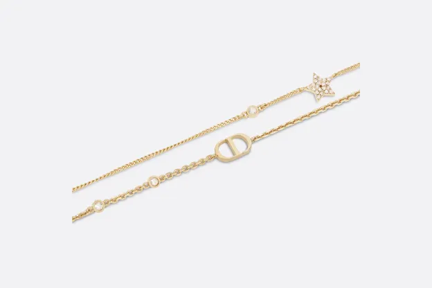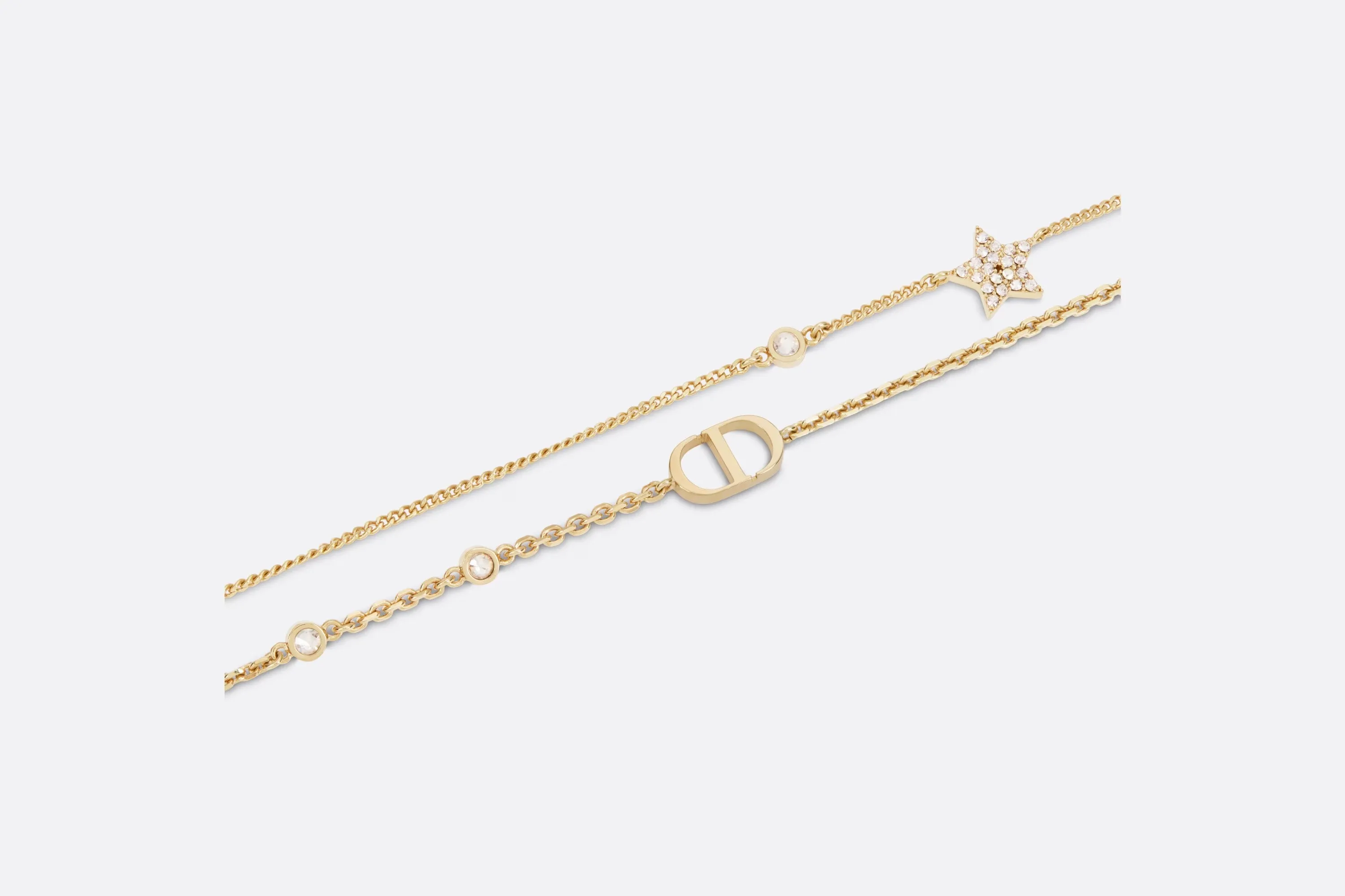 2本のゴールドトーンメタルのチェーンの一方にCDシグネチャーをあしらった、Petit CD ネックレス。もう一方のチェーンには、ホワイト クリスタルをパヴェ セッティングした、ムッシュ ディオールが愛したスターのシンボルと、控えめなホワイトのクリスタルを1つずつ飾りました。デイリーにお使いいただける、タイムレスでエレガントなネックレスです。