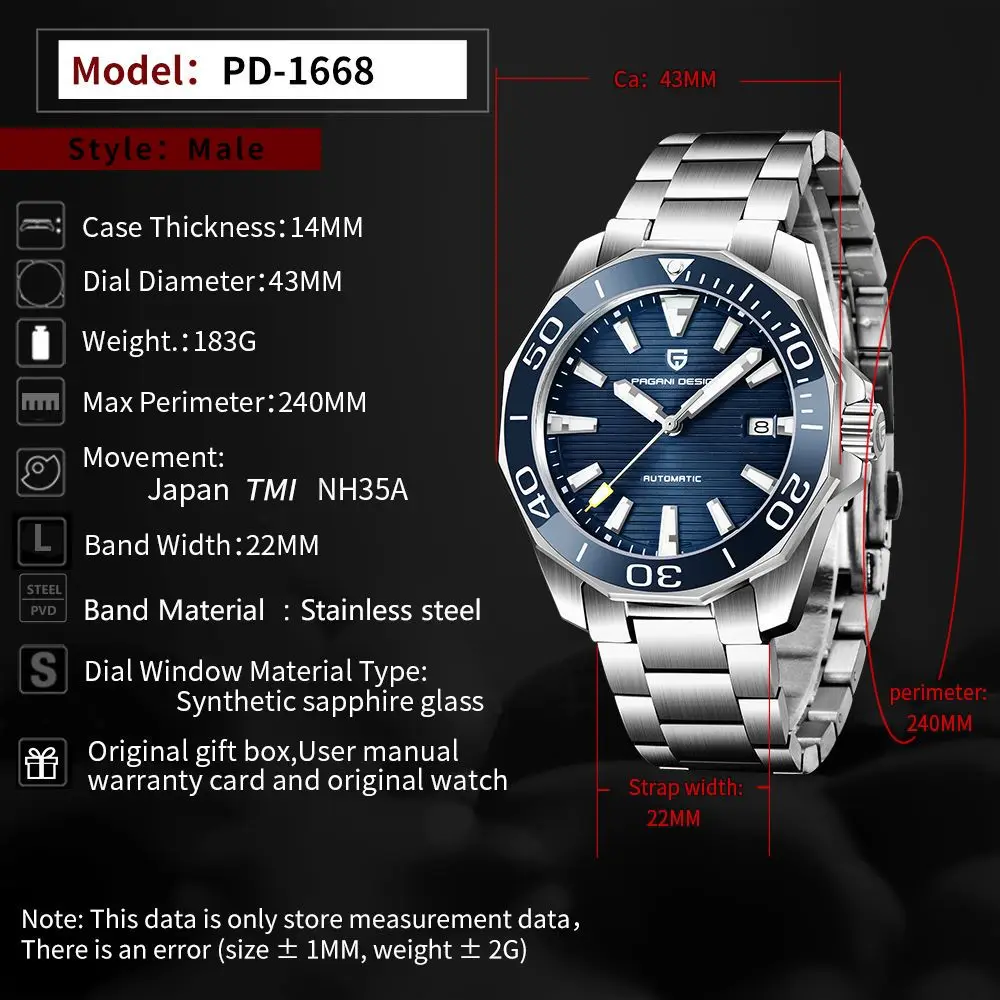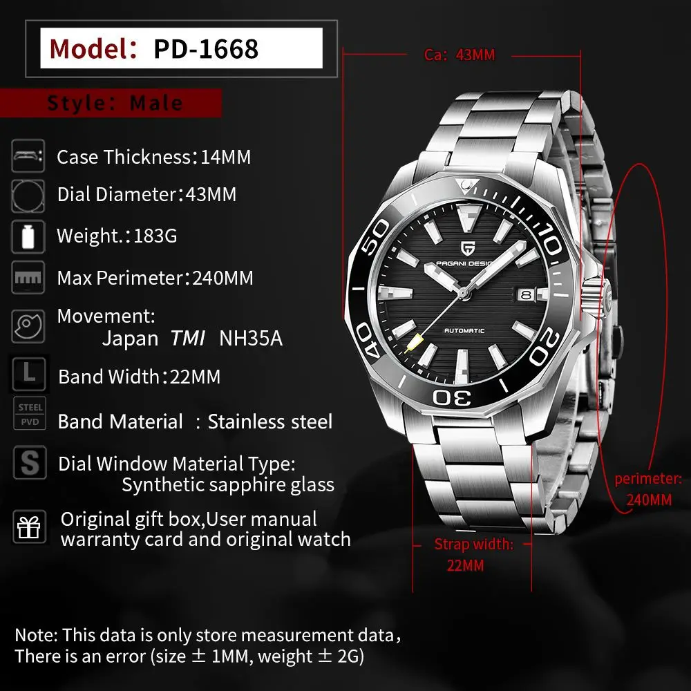 PAGANI DESIGN Men Watch 10ATM Mechanical Japan Movt NH35A Automatic Watches 316L Sapphire Glass Wristwatch