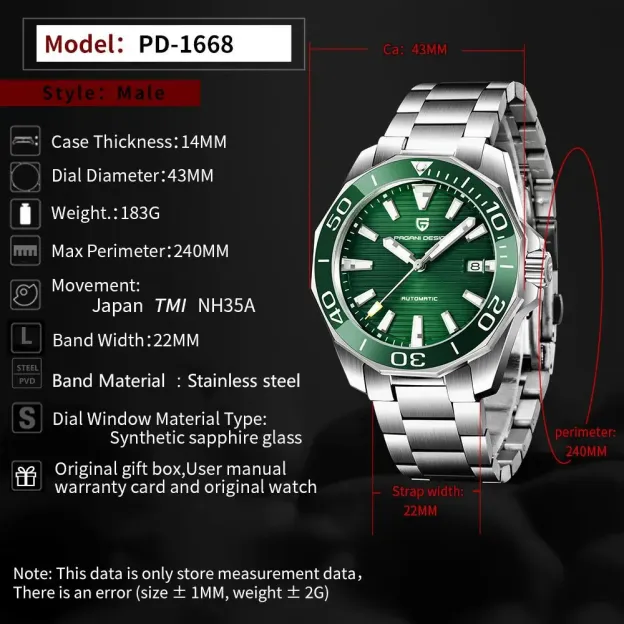 - 316L Stainless steel case - 316L Stainless steel / Genuine leather Strap - Mechanical Movt: Japan Seiko NH35A - 100M water resistant - Auto date - Paper Gift Box