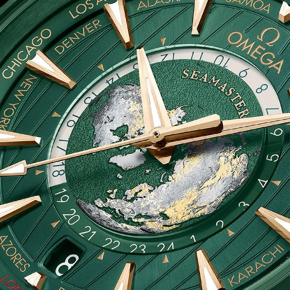 OMEGA Seamaster Aqua Terra GMT Worldtimer 43mm Green Dial Strap Watch 220.32.43.22.10.001. Stainless steel 43mm case and green ceramic bezel all on a green structured rubber strap. This men's watch has a sun-brushed green dial with golden & luminous applied hands and hour markers as well as a date display at the 6 o'clock position & GMT function set around the dial. Water resistant up to 150m and sapphire crystal glass. 60 hour power reserve. OMEGA Calibre 8938 METAS approved automatic movement.